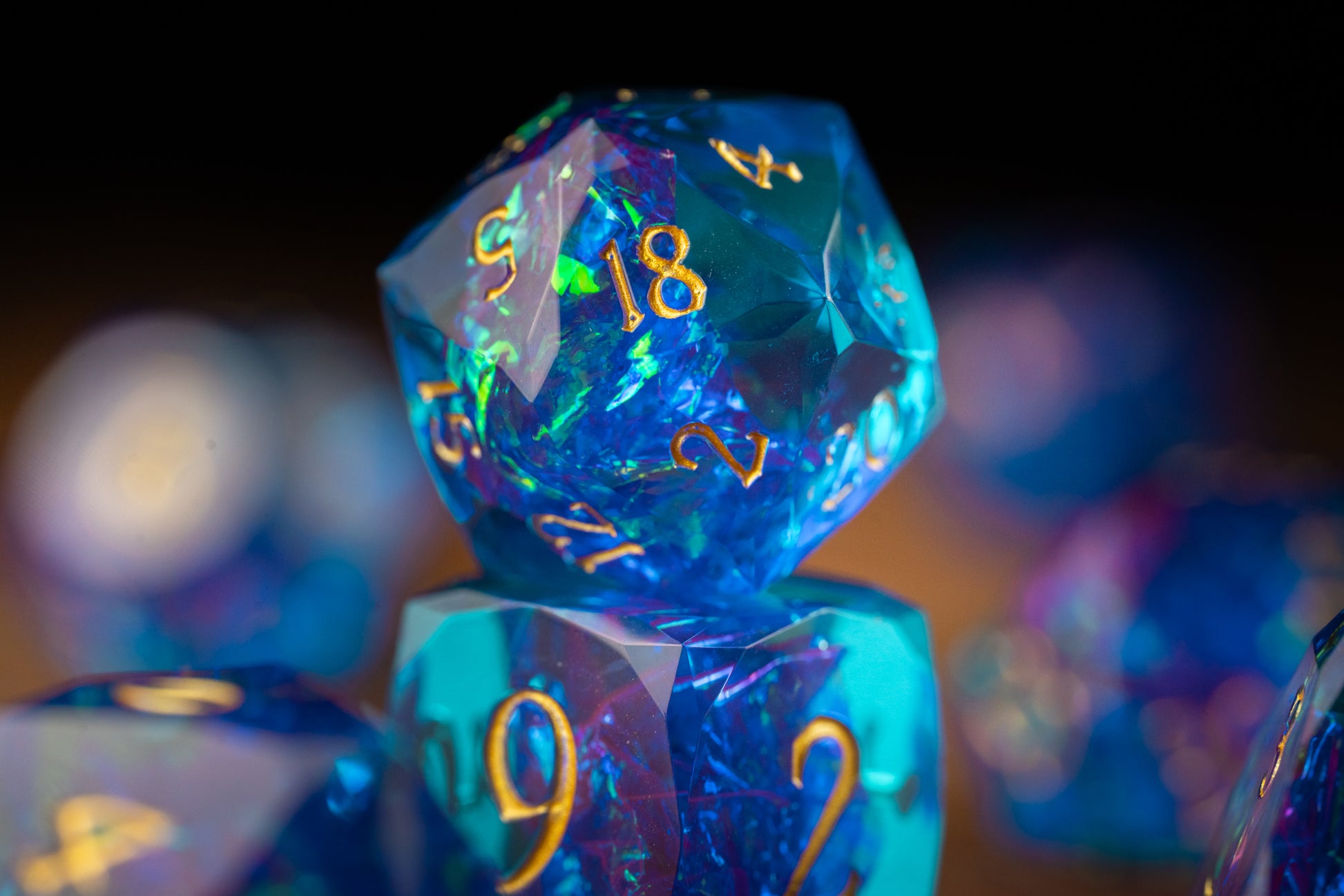 This sharp-edge D&D dice set features diamond-cut polyhedral dice with chamfered edges and a crystal-clear, gemstone finish. Designed for Dungeons & Dragons and tabletop RPGs, each handcrafted 7-piece dice set showcases vibrant nebula-inspired colors, including emerald green, blue, purple, pink, and cosmic blends. Ideal for RPG players, collectors, and anyone searching for premium sharp-edge DND dice or diamond-cut polyhedral dice sets.