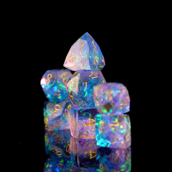This sharp-edge D&D dice set features diamond-cut polyhedral dice with chamfered edges and a crystal-clear, gemstone finish. Designed for Dungeons & Dragons and tabletop RPGs, each handcrafted 7-piece dice set showcases vibrant nebula-inspired colors, including emerald green, blue, purple, pink, and cosmic blends. Ideal for RPG players, collectors, and anyone searching for premium sharp-edge DND dice or diamond-cut polyhedral dice sets.