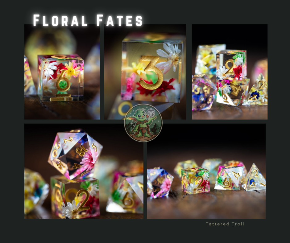 Get ready to add some blooming beauty to your game with Floral Fates dice! These dice are not only gorgeous, but they also hold the secrets of fate within their floral inclusions, adding an air of mystery and intrigue to each roll. It's like strolling through a fragrant field of flowers with each roll, taking you on an enchanted journey with each toss. So let Floral Fates decide your next move and bring some floral magic to your game play!